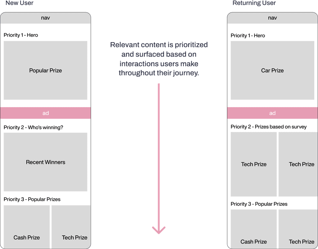 We built the new PCH experience on Adobe’s Experience Manager, which gave us access to the Adobe Target personalization engine. Through Target, we were able to define our page layouts through sets of rules based on what users chose in the onboarding flow. Prizes and content is dynamically populated based on those initial user selections. Then, as usage increases, content is populated based on the user’s interactions.